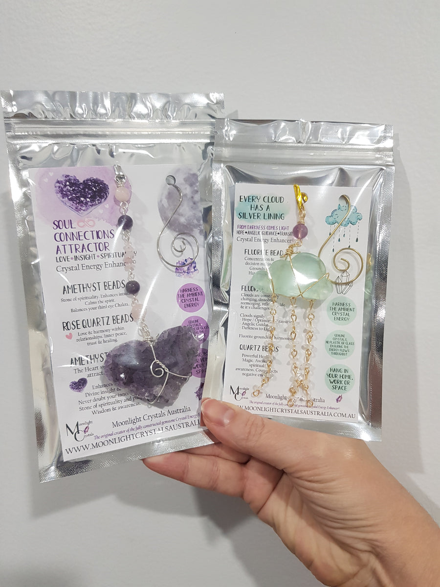 Every piece is lovingly handcrafted and designed with intuitively selected high quality gemstone crystals & beads. We use genuine gemstones within our Crystal Energy Enhancers. NO plastic or glass. This ensures crystal energy flows freely through the piece.