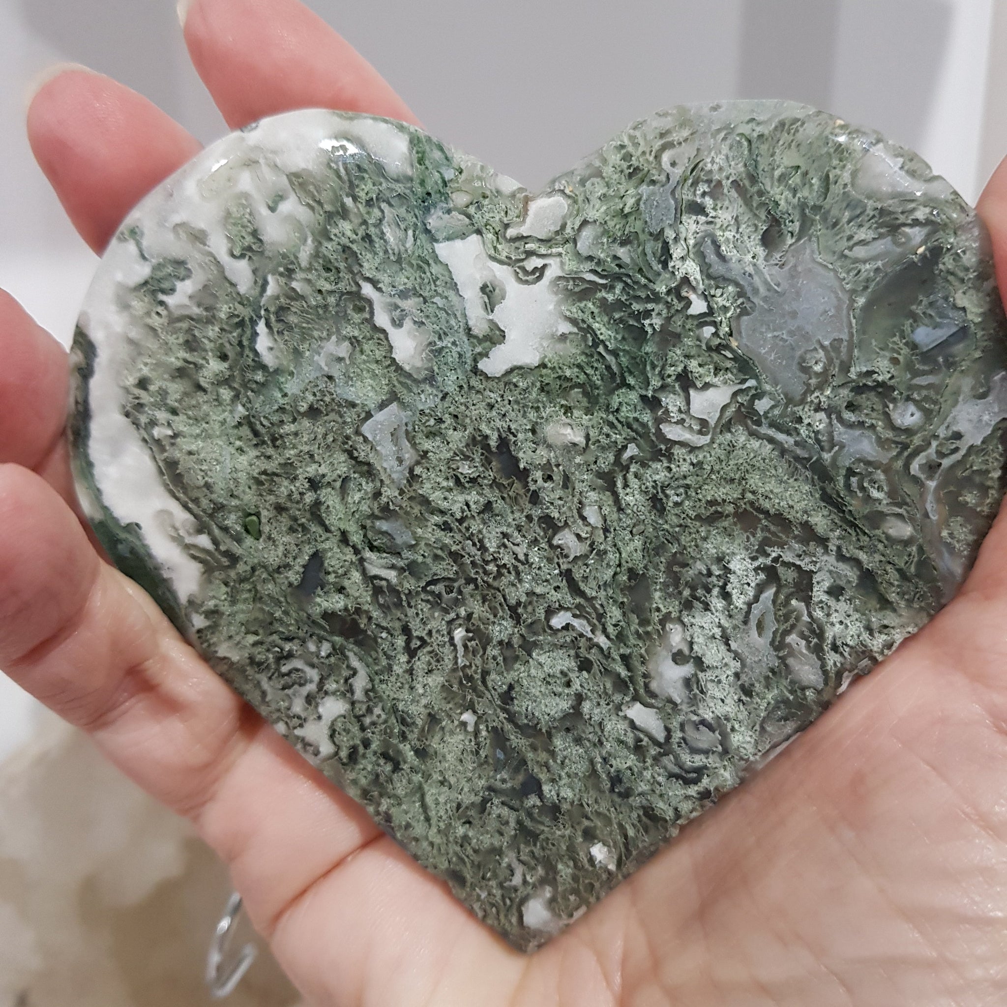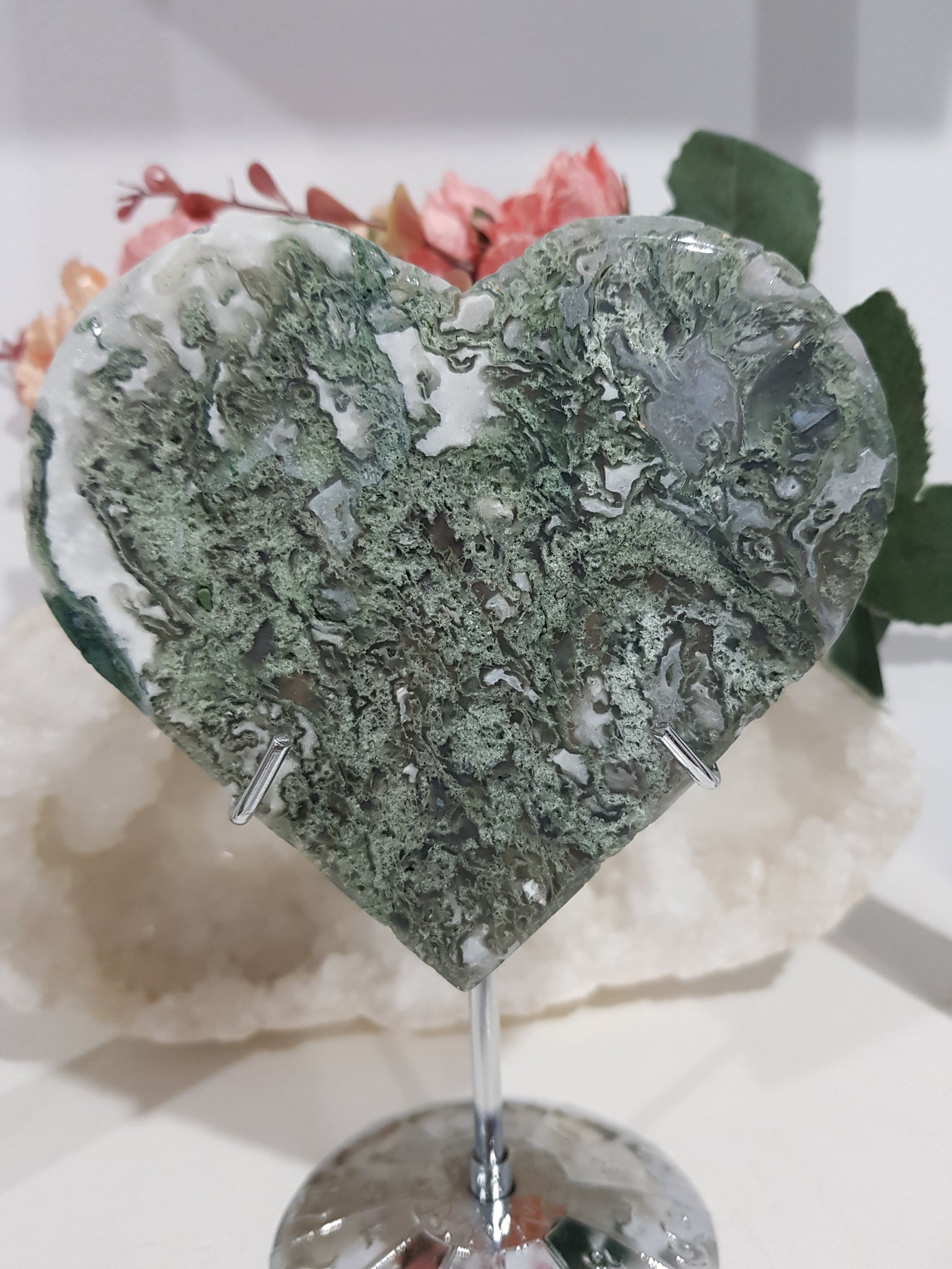 Heart Moss Agate Crystal Carving on Stand Stone STUNNING