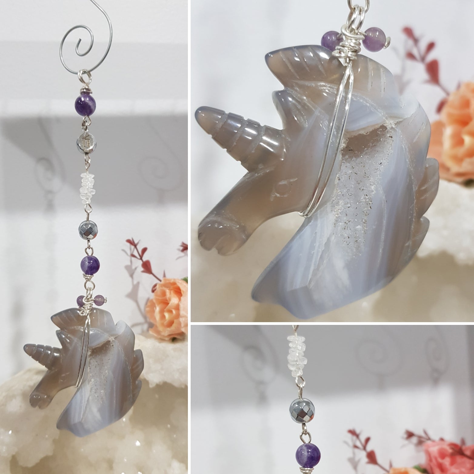 Beautiful Agate Unicorn Carving Crystal Energy Enhancer© / Sun Catcher / Ornament / Hanger beaded with Amethyst, Hematite and quartz.  wired in silver