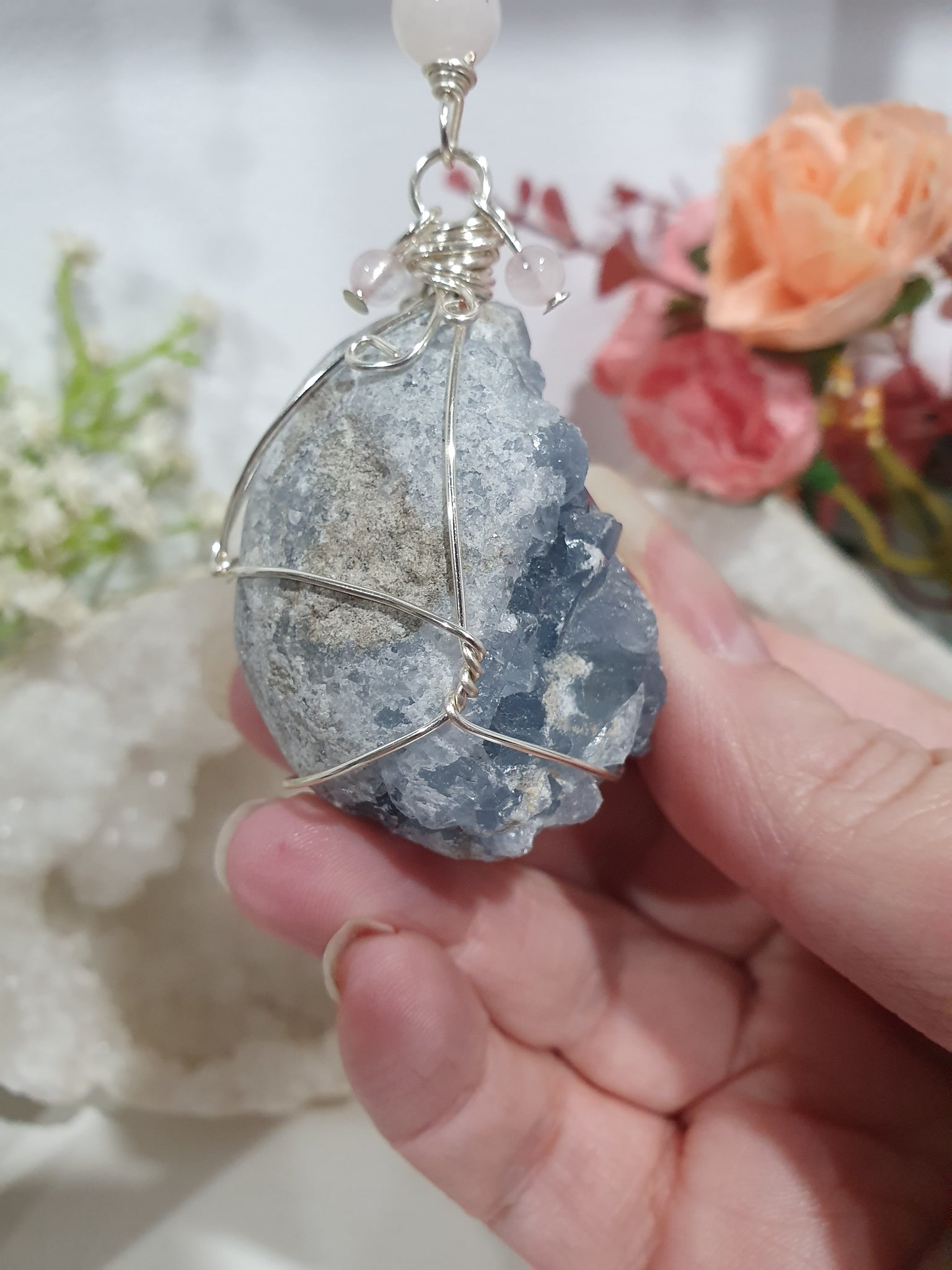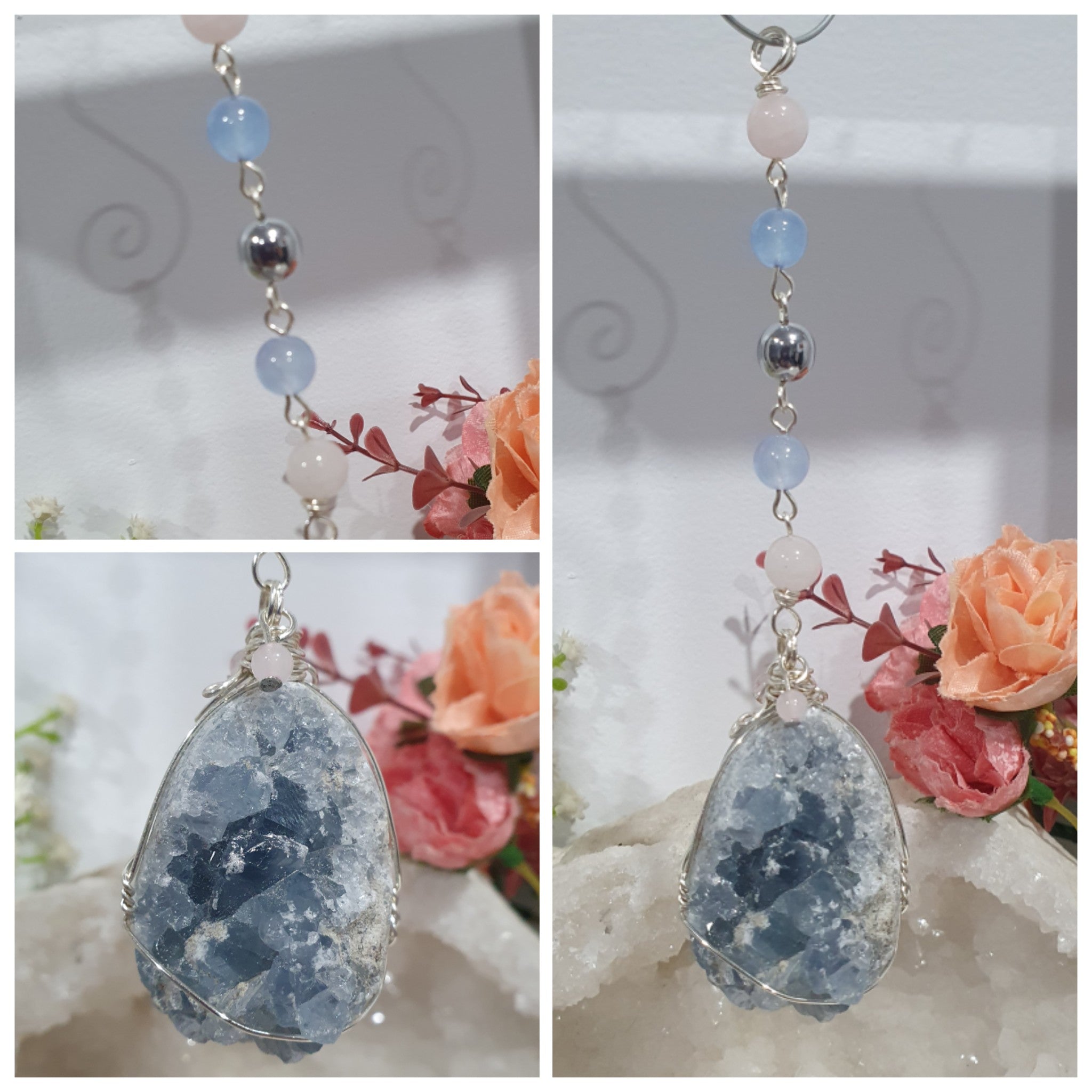 Gorgeous Blue Celestite Crystal Egg specimen beaded with Rose Quartz. Blue Jade and Hematite. wired in Silver