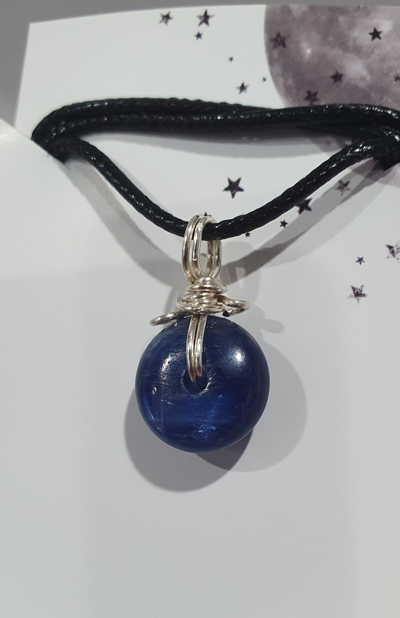 Stunning Blue Kyanite donut crystal carving stone pendant with black cord. Handcrafted / wire wrapped in non tarnish silver wire.