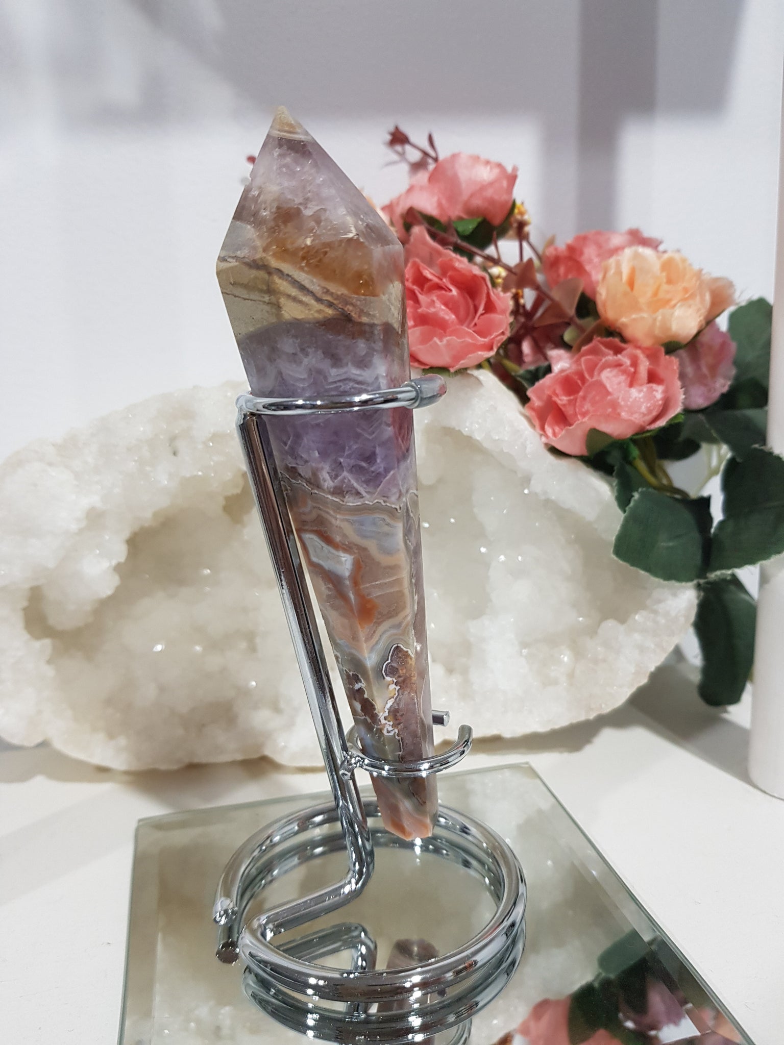 Beautiful Amethyst Agate Crystal Carving Stone Sceptor on Silver Stand.