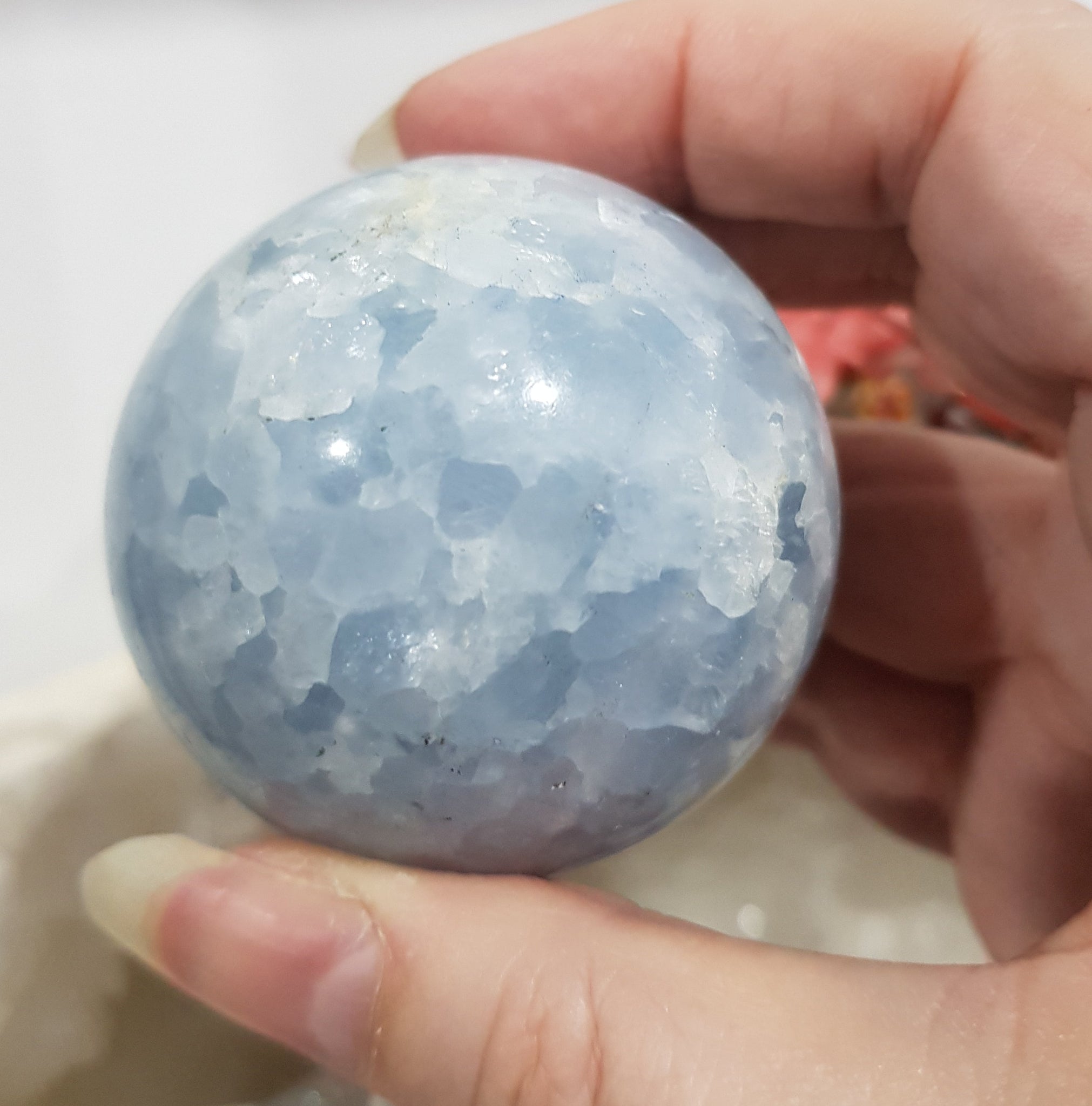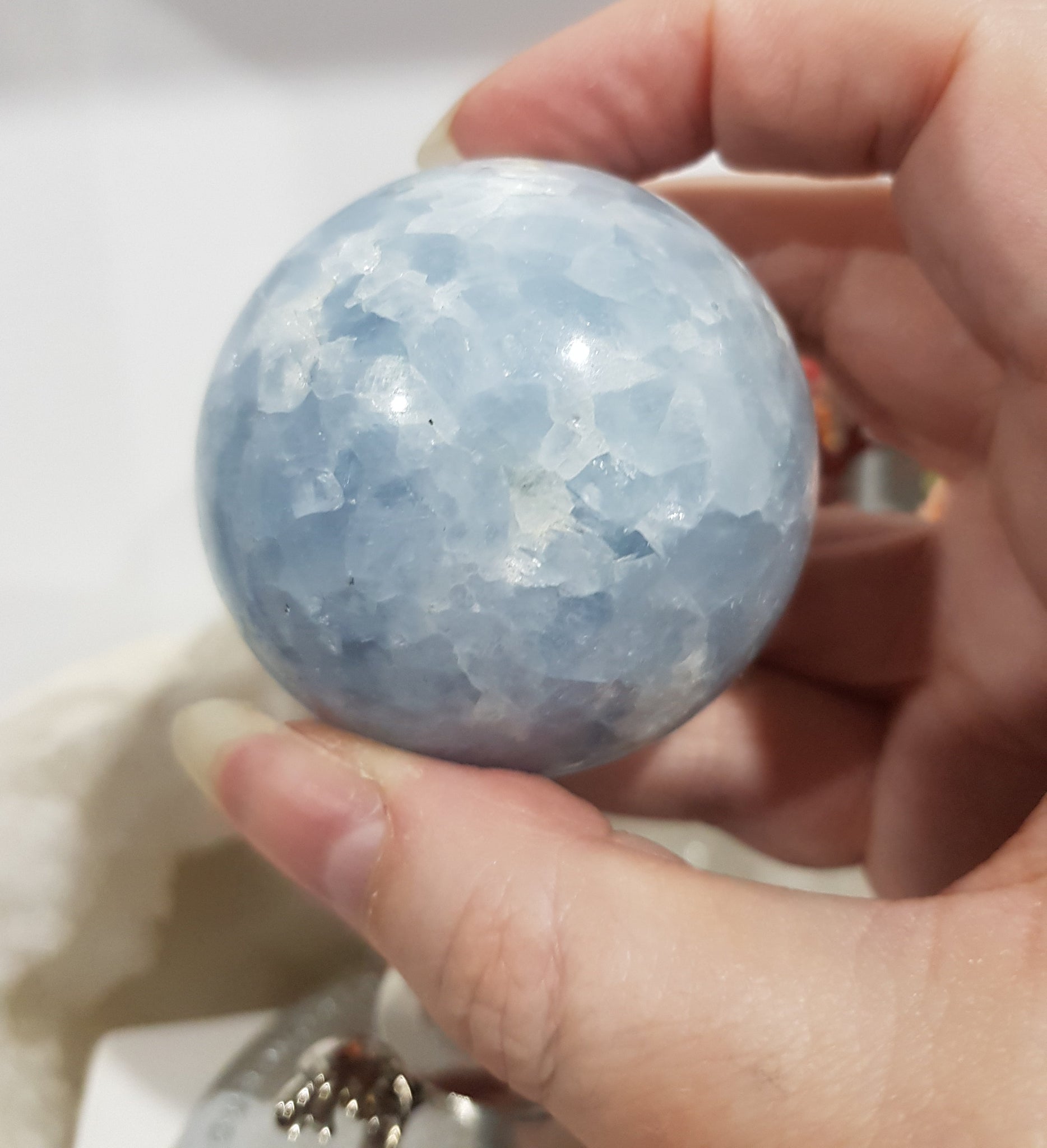 Gorgeous Crystal Celestite sphere on silver stand. so stunning