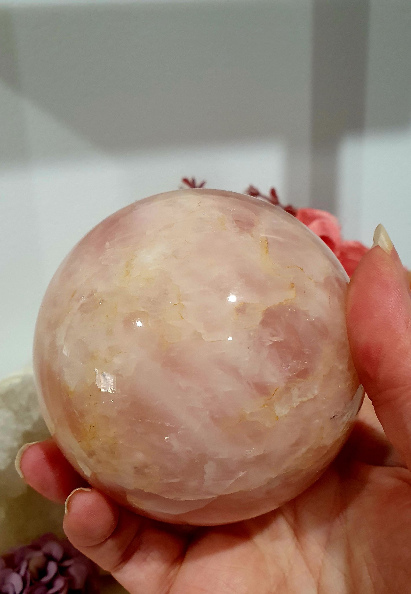 Beautiful polished natural Rose Quartz Sphere Crystal Carving Stone on Gold stand. Sphere has lovely inclusions. Lovely large size of 8.5cm!