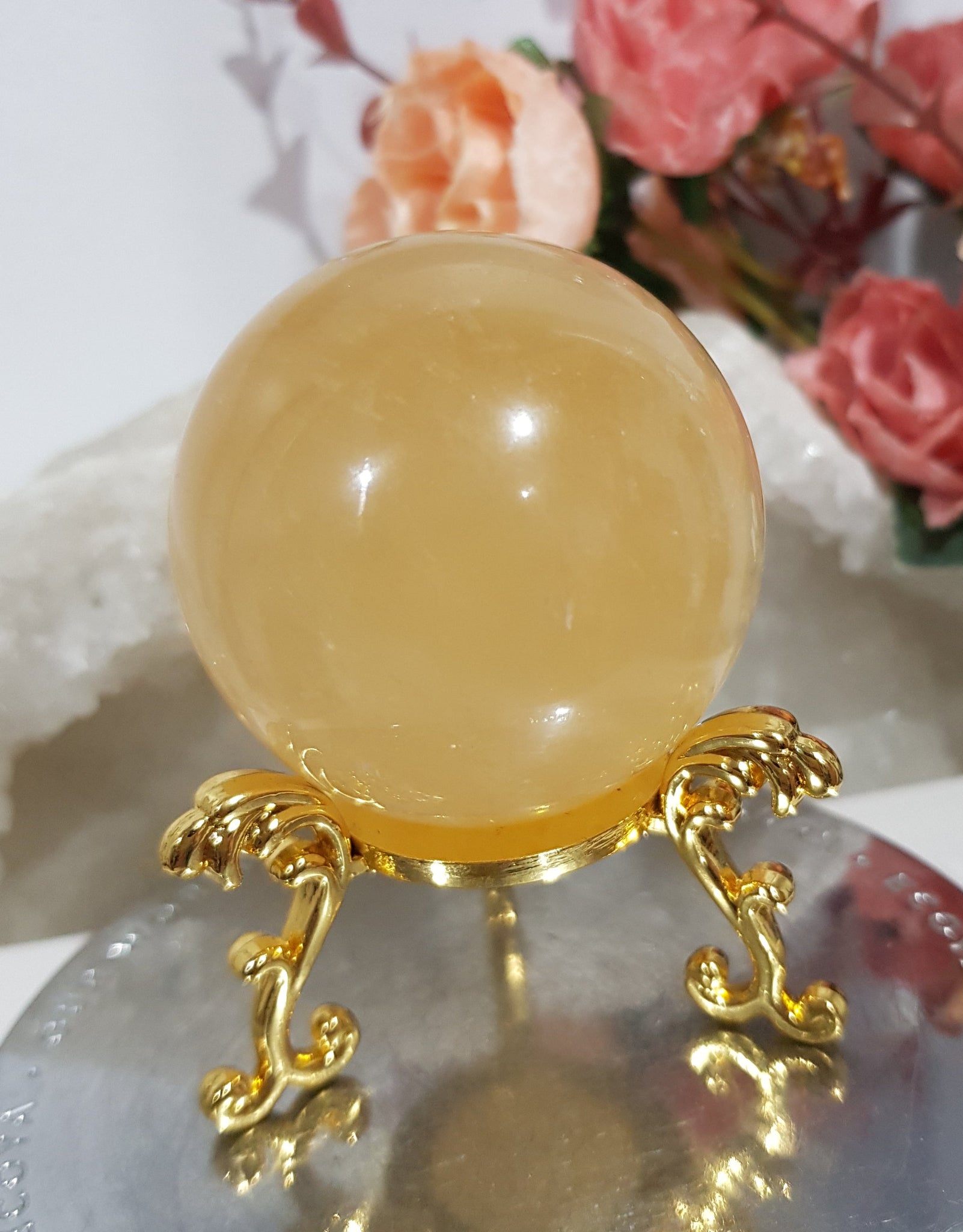 Honey Calcite Sphere Crystal Carving on gold stand