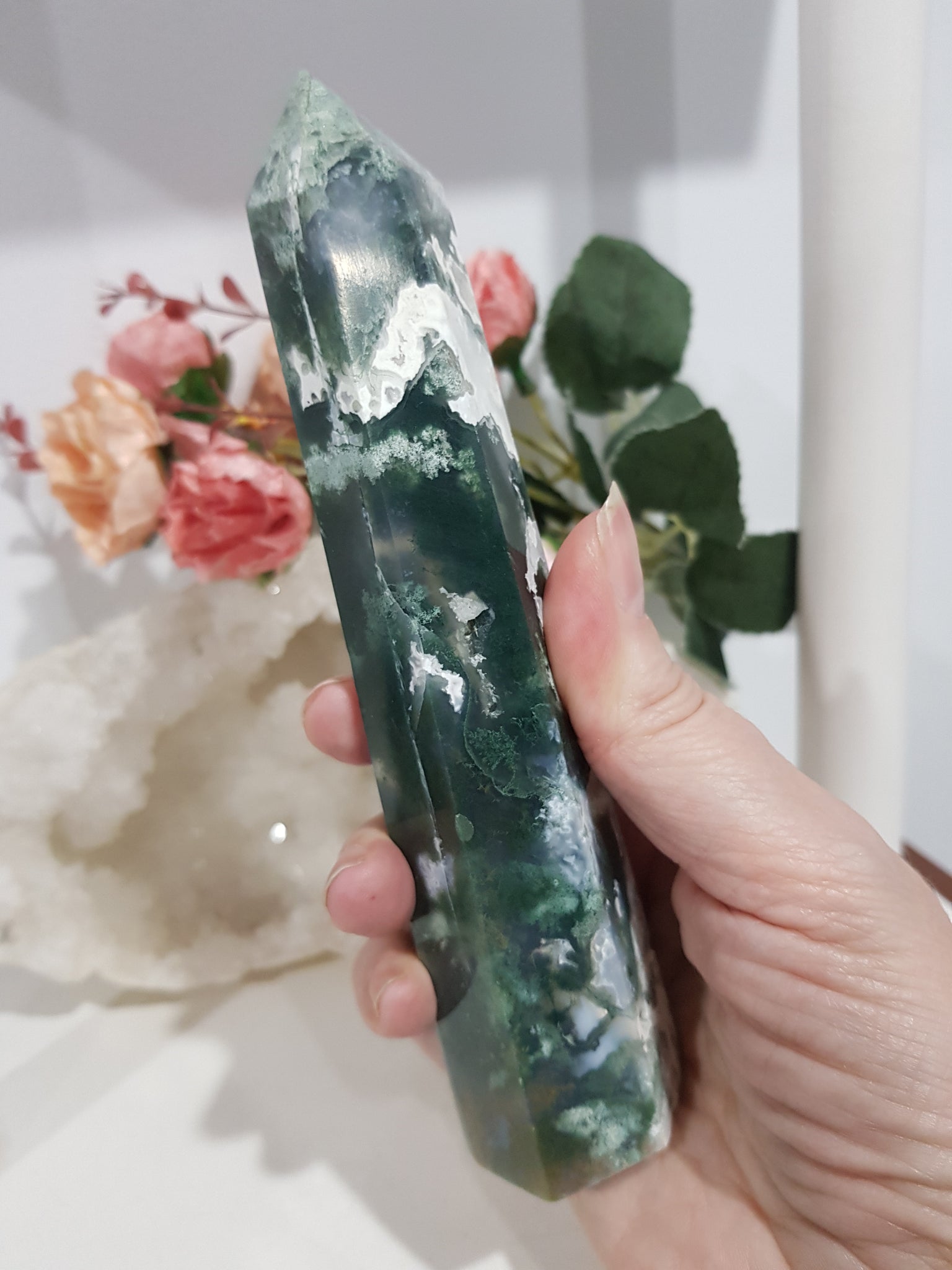 Moss Agate Crystal Tower Stone. this is a tad wobbly but amazing formation.