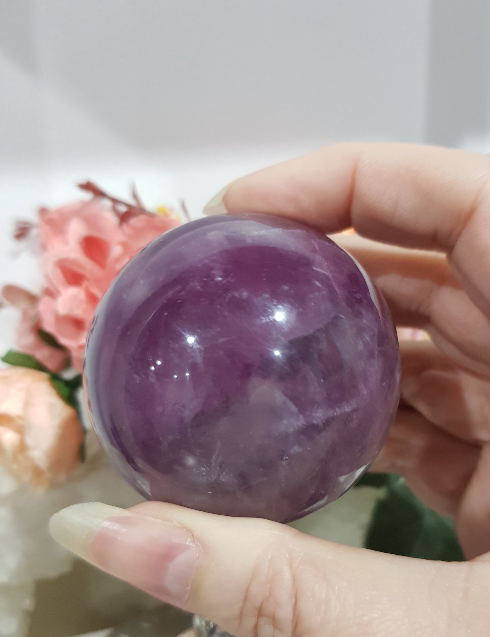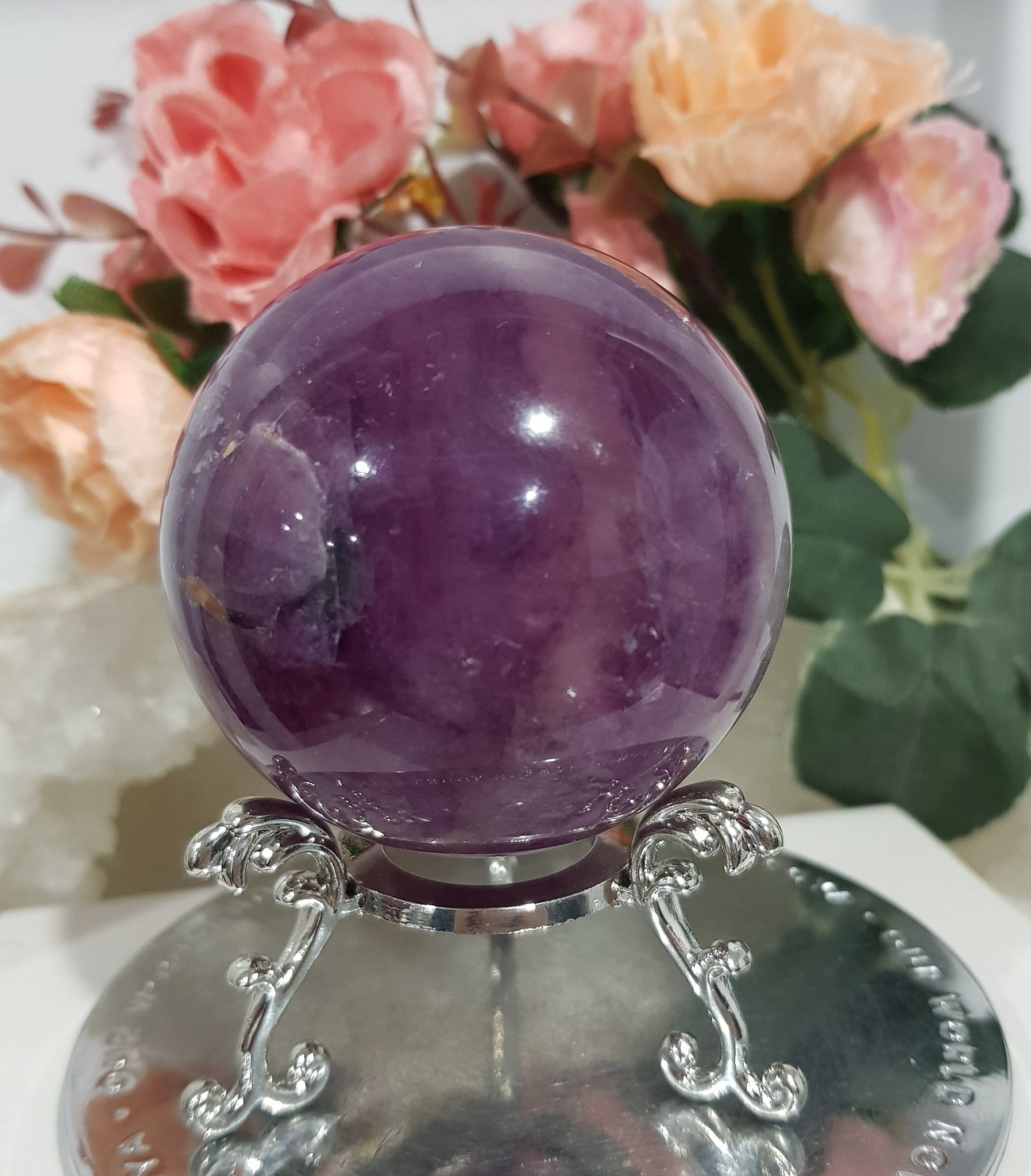 Purple Fluorite Sphere on silver stand. has some brilliant shine and lovely inclusions.