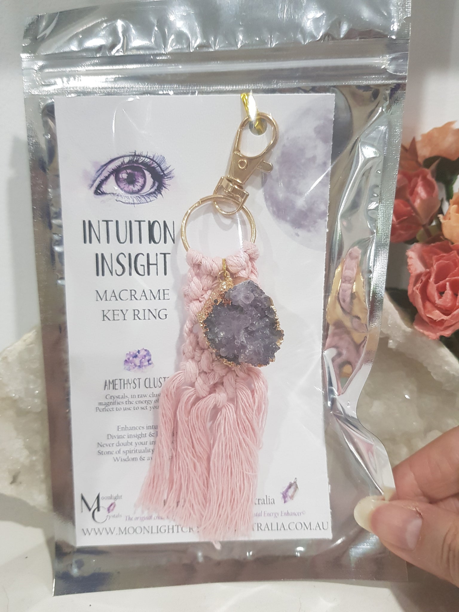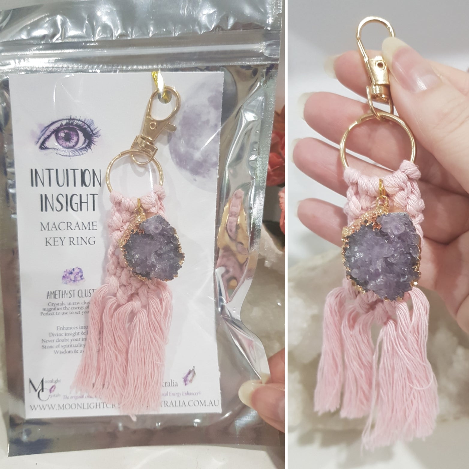 KEY RING Pink Macrame - INTUITION / INSIGHT - Amethyst Crystal Cluster Stone 150mm 3 KEYRING